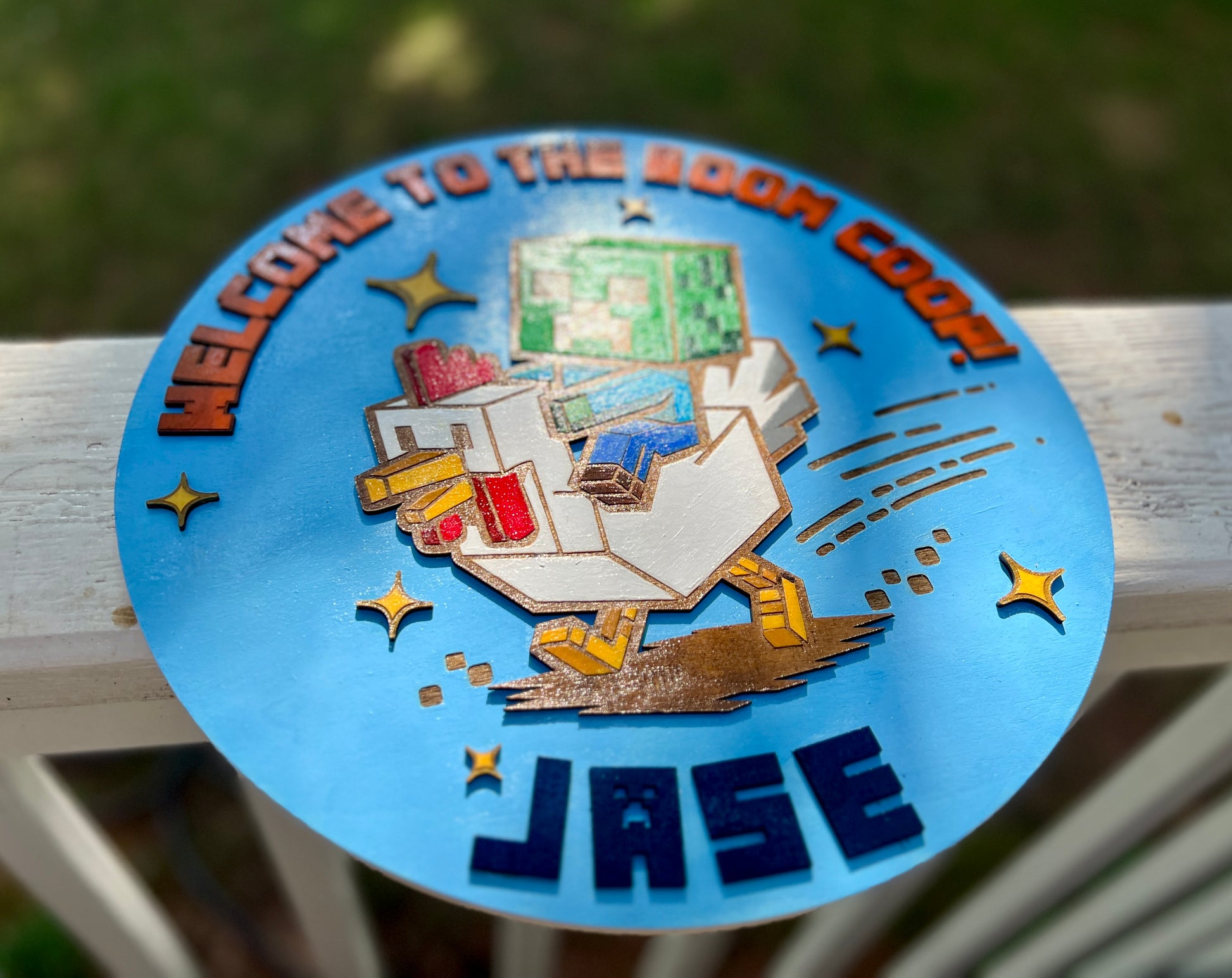 Bring your gamer’s world to life with this Minecraft-inspired custom wood sign! Featuring a playful design of a Creeper-headed rider on a chicken with bright, bold colors and 3D layered details, this sign is sure to make any Minecraft fan smile. The phrase “Welcome to the Boom Coop!” adds extra fun, while the bottom is personalized with your child’s name for a unique touch.